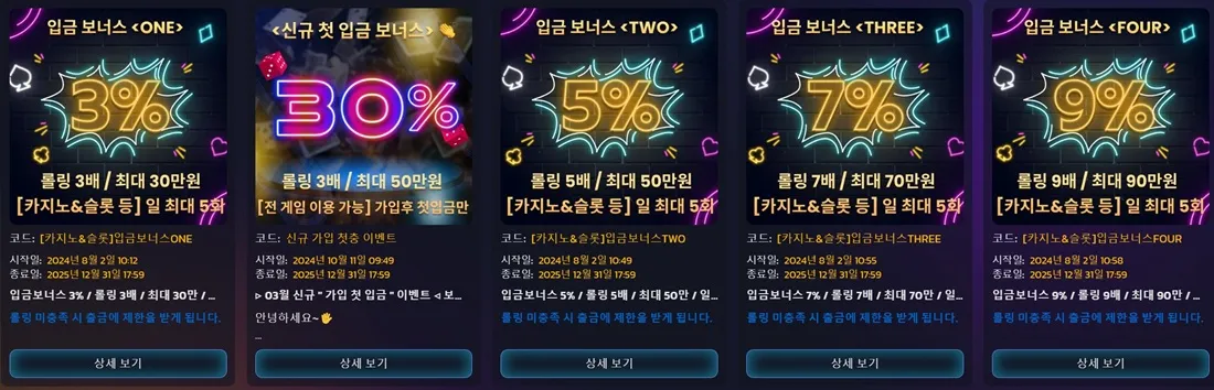 입금보너스 3% / 롤링 3배 / 최대 30만원 [카지노&슬롯 등] 일 최대 5회 제공